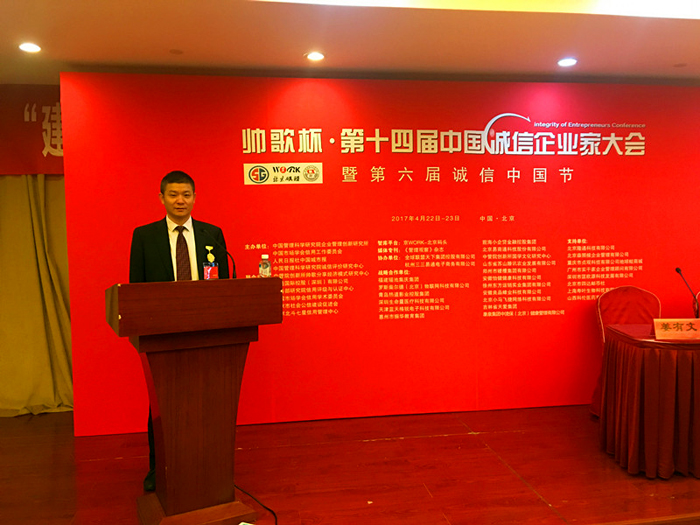 2017年4月22日,第十四屆中國誠信企業(yè)家大會暨第六屆誠信中國節(jié)在北京人民大會堂、釣魚臺國賓館隆重舉辦。本次會議以“新常態(tài)下誠信建設與企業(yè)家精神”為主題,安排了經濟學家特邀報告會、誠信建設大講壇、專題論壇、誠信標桿企業(yè)家盛會、企業(yè)對接合作洽談等多元活動。各有關領導、專家學者以及來自全球各地各行業(yè)企業(yè)家、商界精英、媒體等代表千余人,會議規(guī)模宏大,座無虛席,反響熱烈。